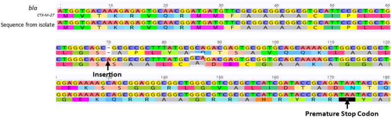 - A blaCTX-M-27 variant harboring a premature stop codon.